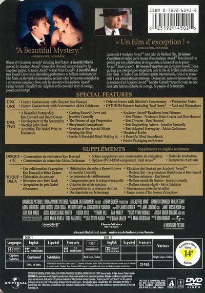 Winner of 4 Academy Awards® including Best Picture, A Beautiful Mind is directed by Academy Award® winner Ron Howard and produced by his long-time partner, Academy Award® winner Brian Grazer. A Beautiful Mind stars Russell Crowe in an astonishing performance as brilliant mathematician John Nash, on the brink of international acclaim when he becomes entangled in a mysterious conspiracy. Now, only his devoted wife (Academy Award® winner Jennifer Connelly) can help him in this powerful story of courage, passion and triumph.Lauréat de 4 Academy Award dont celui du Meilleur film, Un Homme d’Exception est réalisé par le lauréat d’un Academy Award Ron Howard et produit par son collaborateur de longue date, le lauréat d’un Academy Award Brian Grazer. Un Homme d’Exception met en vedette Russell Crowe qui livre une interprétation stupéfiante dans le rôle du brillant mathématicien John Nash. A l’aube d’une brillante carrière internationale, celui-ci se trouve mêlé à une conspiration mystérieuse. Dorénavant, seule son épouse dévouée (la lauréate d’un Academy Award Jennifer Connelly) peut lui venir en aide dans cette histoire édifiante de courage, de passion et de triomphe.