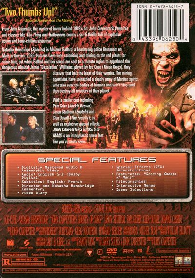 From John Carpenter, the master of horror behind 1998's hit John Carpenter's Vampires and classics like The Thing and Halloween, comes a sci-fi thriller full of explosive action and bone chilling suspense.Natasha Henstridge (Species) is Melanie Ballard, a headstrong police lieutenant on Mars in the year 2025. Humans have been colonizing and mining on the red planet for some time, but when Ballard and her squad are sent to a remote region to apprehend the dangerous criminal James "Desolation" Williams, played by Ice Cube (Three Kings), they discover that he's the least of their worries. The mining operations have unleashed a deadly army of Martian spirits who take over the bodies of humans and won't stop until they destroy all invaders of their planet.With a stellar cast including Pam Grier (Jackie Brown), Jason Statham (Snatch) and Clea Duvall (The Faculty) as well as explosive special effects, JOHN CARPENTER'S GHOSTS OF MARS is an intergalactic terror fest like you've never seen.