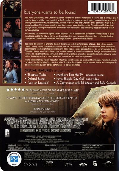Bob Harris (Bill Murray) and Charlotte (Scarlett Johansson) are two Americans in Tokyo. Bob is a movie star in town to shoot a whiskey commercial, while Charlotte is a young woman tagging along with her workaholic photographer husband (Giovanni Ribisi). Unable to sleep, Bob and Charlotte cross paths one night in the luxury hotel bar. This chance meeting soon becomes a surprising friendship. Charlotte and Bob venture through Tokyo, having often hilarious encounters with its citizens, and ultimately discover a new belief in life's possibilities.Shot entirely on location in Japan, Sofia Coppola's Lost in Translation is a valentine to the nature of close friendships and to the city of Tokyo. Ms. Coppola's film, from her original screenplay, contemplates the unexpected connections we make that might not last - yet stay with us forever. ---------------------------------------------------------Bob Harris (Bill Murray) et Charlotte (Scarlett Johansson) sont deux Américains à Tokyo. Bob est une star du cinéma venu y tourner une publicité pour une marque de whisky alors que Charlotte est une jeune femme qui accompagne son mari photographe (Giovanni Ribisi) très accaparé par ses affaires. Un soir d’insomnie, Bob et Charlotte croisent leur route dans un bar d’un hôtel luxueux et une étonnante amitié émerge de cette rencontre fortuite. En s’aventurant dans Tokyo, Bob et Charlotte y font des rencontres amusantes parmi les citoyens, mais surtout, ils découvrent de nouveaux horizons vers une vie jusque-là insoupçonnée.Tourné entièrement au Japon, Traduction Infidèle de Sofia Coppola est un vibrant hommage à l’amitié et a la ville de Tokyo. Le film de Mlle Coppola, dont elle a écrit le scenario original, explore avec finesse les conséquences de nos rencontres qui sont parfois éphémères – et parfois éternelles.