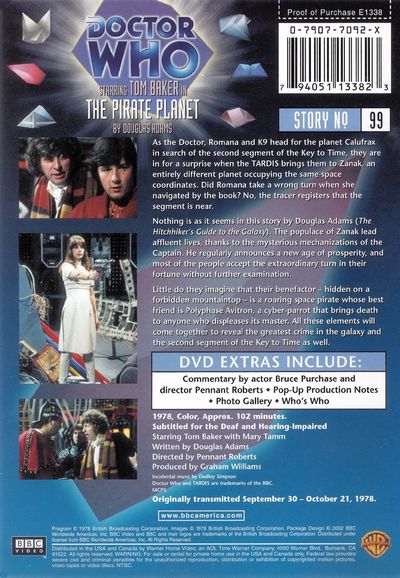 As the Doctor, Romana and K9 head for the Planet Calufrax in search of the second segment of the Key to Time, they are in for a surprise when the TARDIS brings them to Zanak, an entirely different planet occupying the same space coordinates. Did Romana take a wrong turn when she navigated by the book? No, the tracer registers that the segment is near.Nothing is as it seems in this story by Douglas Adams (The Hitchhiker's Guide to the Galaxy). The populace of Zanak lead affluent lives, thanks to the mysterious mechanizations of the Captain. He regularly announces an new age of prosperity, and most people accept the extraordinary turn in their fortune without further examination.Little do they imagine that their benefactor - hidden on a forbidden mountaintop - is a roaring space pirate whose best friend is Polyphase Avitron, a cyber-parrot that brings death to anyone who displeases its master. All these elements will come together to reveal the greatest crime in the galaxy and the second segment of the Key to Time as well.