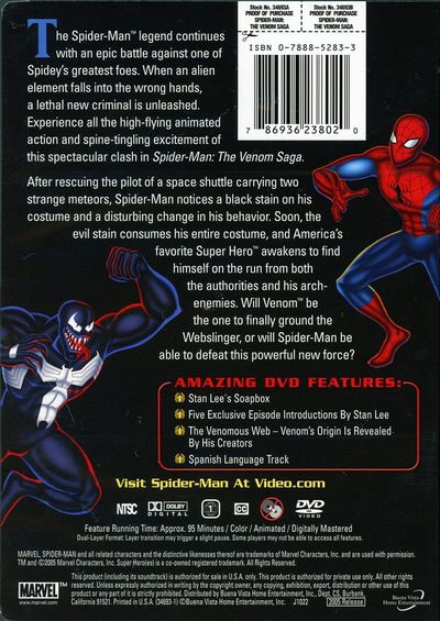 The Spider-Man legend continues with an epic battle against one of Spidey's greatest foes. When an alien element falls into the wrong hands, a lethal new criminal is unleashed. Experience all the high-flying animated action and spine-tingling excitement of this spectacular clash in Spider-Man: The Venom Saga.After rescuing the pilot of a space shuttle carrying two strange meteors, Spider-Man notices a black stain on his costume and a disturbing change in his behavior. Soon, the evil stain consumes his entire costume, and America's favorite Super Hero awakens to find himself on the run from both the authorities and his arch-enemies. Will Venom be the one to finally ground the Webslinger, or will Spider-Man be able to defeat this powerful new force? |