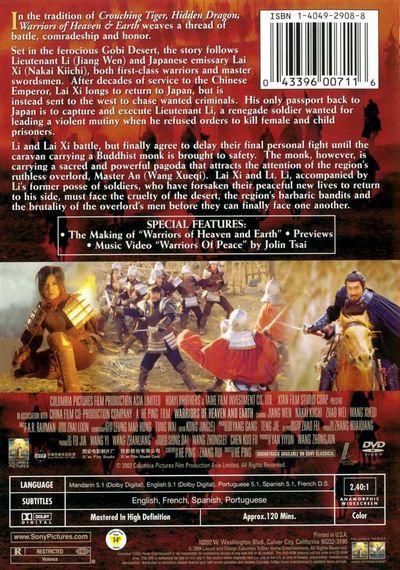 In the tradition of Crouching Tiger, Hidden Dragon, Warriors of Heaven & Earth weaves a thread of battle, comradeship and honor.Set in the ferocious Gobi Desert, the story follows Lieutenant Li (Jiang Wen) and Japanese emissary Lai Xi (Nakai Kiichi_, both firs-class warriors and master swordsmen. After decades of service to the Chinese Emperor, Lai Xi longs to return to Japan, but is instead sent to the west to chase wanted criminals. His only passport back to Japan is to capture and execute Lieutenant Li, a renegade soldier wanted for leading a violent mutiny when he refused orders to kill female and child prisoners.Li and Lai Xi battle, but finally agree to delay their final personal fight until the caravan carrying a Buddhist monk is brought to safety. The monk, however, is carrying a sacred and powerful pagoda that attracts the attention of the region's ruthless overlord, Master An (Wang Xuengi). Lai Xi and Lt. Li, accompanied by Li's former posse of soldiers, who have forsaken their peaceful new lives to return to his side, must face the cruelty of the desert, the region's barbaric bandits and the brutality of the overlord's men before they can finally face one another.
