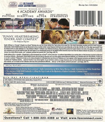 Dustin Hoffman is a "triumph" (People) in an Oscar®-Winning role, and Tom Cruise delivers the "best acting of his career [in a film that's] fascinating, touching and full of smart surprises" (Newsweek). Charlie Babbitt (Cruise) has just discovered he has an autistic brother named Raymond (Hoffman) and is now taking him on the ride of his life. Or is it the other way around? From his refusal to drive on major highways to a "four minutes to Wapner" meltdown at an Oklahoma farmhouse, Raymond first pushes hot-headed Charlie to the limits of his patience...and then pulls him completely out of his self-centered world! But what begins as an unsentimental journey for the Babbitt brothers becomes much more than the distance between two places. It's a connection between two vastly different people...and "a poignant, profound and powerful film" (Joel Siegel, ABC-TV). |