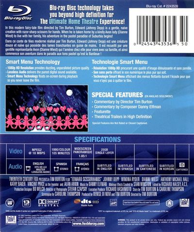 In this modern fairy-tale film directed by Tim Burton, Edward (Johnny Depp) is a gentle, naive creation with razor-sharp scissors for hands. When he is taken home by a kindly Avon lady (Dianne Wiest) to live with her family, his adventure in the pastel paradise of Suburbia begins! Dans ce conte de fées moderne réalisé par Tim Burton, Edward (Johnny Depp) est une créature douce et naïve qui possède des lames tranchantes en guise de mains. Il est recueilli par une gentille représentante Avon (Dianne Wiest) qui l'amène chez elle pour vivre avec sa famille, et ainsi commence son aventure dans le paradis aux tons pastel qu'est la Banlieue! |