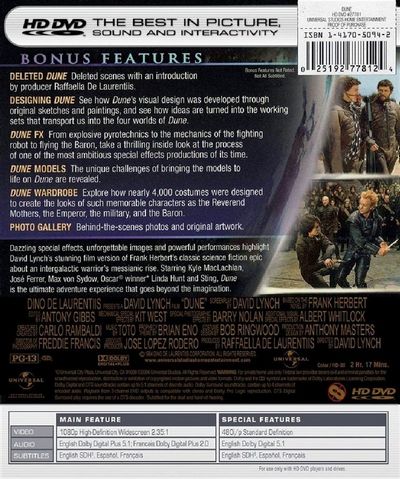 Dazzling special effects, unforgettable images and powerful performances highlight David Lynch's stunning film version of Frank Herbert's classic science fiction epic about an intergalactic warrior's messianic rise. Starring Kyle MacLachlan, Jose Ferrer, Max Von Sydow, Oscar® winner Linda Hunt and Sting, 'Dune' is the ultimate adventure experience that goes beyond the imagination. |