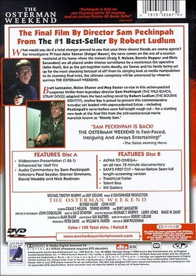 What would you do if a total stranger proved to you that your three closest friends are enemy agents? For investigative TV host John Tanner (Rutger Hauer), the news comes on the eve of a reunion weekend at his home where the traitors (Craig T. Nelson, Dennis Hopper and Chris Sarandon) are all placed under intense surveillance by a mysterious CIA operative (John Hurt). But as the get-together turns deadly, are Tanner and his family being set up for the most shocking betrayal of all? From its stinging look at media manipulation to its stunning final twist, the ultimate conspiracy will be uncovered by whoever survives THE OSTERMAN WEEKEND.Burt Lancaster, Helen Shaver and Meg Foster co-star in this action-packed suspense thriller from legendary director Sam Peckinpah (THE WILD BUNCH, STRAW DOGS) adapted from the best-selling novel by Robert Ludlum (THE BOURNE IDENTITY). Anchor Bay is proud to present this commemorative two-disc set loaded with unprecedented Extras including Peckinpah s never-before-seen full-length rough cut for a startling new look at the final film from the still- controversial movie maverick known as Bloody Sam. Feature Disc One Widescreen Presentation enhanced for 16x9 TVs Audio Commentary by Sam Peckinpah historians Paul Seydor, Garner Simmons, David Weddle and Nick RedmanFeature Disc TwoWidescreen Presentation enhanced for 16x9 TVsTheatrical TrailerTalent BiosStill GallerySystem Requirements: Running Time 102 MinFormat: DVD MOVIE