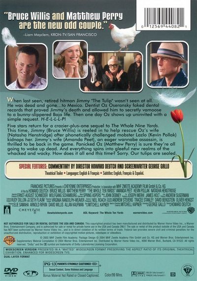 When last seen, retired hitman Jimmy "The Tulip" wasn't seen at all. He was dead and gone... to Mexico. Dentist Oz Oseransky faked dental records that proved Jimmy's death and allowed him to secretly vamoose to a bunny-slippered Baja life. Then one day Oz shows up uninvited with a simple request. H-E-L-L-L-P!Five stars return for a crazier-plus-one sequel to The Whole Nine Yards. This time, Jimmy (Bruce Willis) is reeled in to help rescue Oz's wife (Natasha Henstridge) after phonetically challenged mobster Lazlo (Kevin Pollak) kidnaps her. Jimmy's wife (Amanda Peet), an eager wannabe assassin, is thrilled to be back in the game. Panicked Oz (Matthew Perry) is sure they're all going to wake up dead. And everything spins into gleeful new realms of the whacked and wacky. How does it all end this time? Sorry. Our tulips are sealed. |