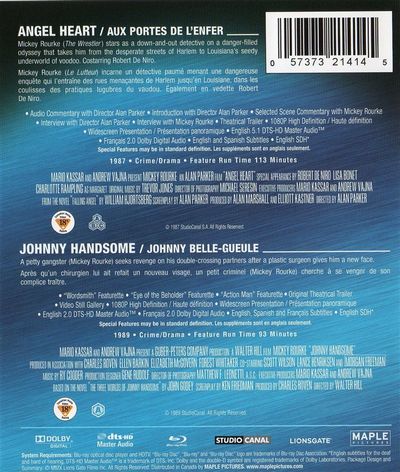 Angel Heart:Mickey Rourke (The Wrestler) Stars as a down-and-out detective on a danger-filled odyssey that takes him from the desperate streets of harlem to Louisiana's seedy underworld of voodoo. Costarring Robert De Niro.Johnny Handsome:A petty gangster (Mickey rourke) seeks revenge on his double-crossing partners after a plastic surgeon gives him a new face. |