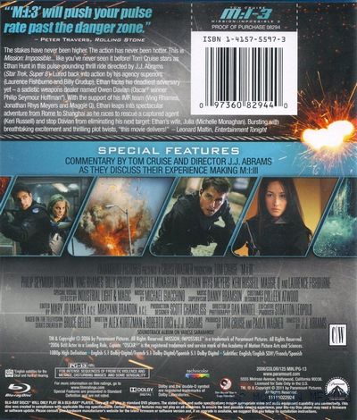 "'M:I:3' will push your pulse rate past the danger zone." - Peter Travers, Rolling StoneThe stake have never been higher. The action as never been hotter. This is Mission: Impossible... like you've never seen before! Tom Cruise stars as Ethan Hunt in this pulse-pounding thrill ride directed by J.J. Abrams (Star Trek, Super 8). Lured back into action by hs agency superiors (Laurence Fishbourne and Billy Crudup), Ethan faces his deadliest adversary yet - a sadistic weapons dealer named Owen Davian (Oscar® winner Philip Seymour Hoffman*). With the support of his IMF team (Ving Rhames, Jonathan Rhys Meyers and Maggie Q), Ethan leaps into spectacular adventure from Rome to Shanghai as he races to rescue a captured agent (Keri Russell) and stop Davian from eliminating his next target: Ethan's wife, Julia (Michelle Monaghan). Bursting with breathtaking excitement and thrilling plot twists, "this movie delivers!" - Leonard Maltin, Entertainment Tonight |
