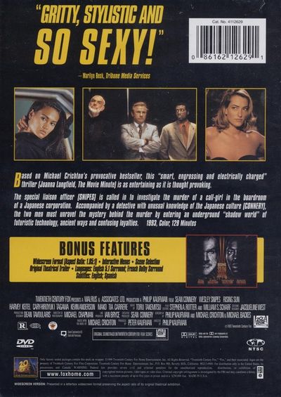Based on Michael Crichton’s provocative bestseller, this “smart, engrossing and electrically charged” thriller (Joanna Langfield, The Movie Minute) is as entertaining as it is thought provoking.The special liaison officer (Snipes) is called in to investigate the murder of a call-girl in the boardroom of a Japanese corporation. Accompanied by a detective with unusual knowledge of the Japanese culture (Connery), the two men must unravel the mystery behind the murder by entering an underground “shadow world” of futuristic technology, ancient ways and confusing loyalties. |