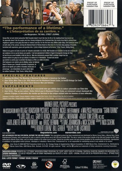Korean War vet and retired autoworker Walt Kowalski doesn't much like how his Iife or his neighbourhood has tumed out. He especially doesn't like the people next door, Hmong immigrants from Soumeast Asia. But events force Walt to defend those neighbours against a local gang that feeds on violence and fear For the lirst time since Million Dollar Baby Clint Eastrood works on both sides ol the camera, winning the National Board ot Review Award as Best Actor for his bone·deap playing of Kowalski, burnished with experience, grace and gravitas into a “prime vintage Eastwood performance” (Peter Travers. Rolling Stone).Vetéran de la guerre de Corée et ouvrier de l'industrie automobile a la retraite, Walt Kawalski est insatisfait a Ia fois de Ia tournure de son existence at de ce qu'est devenu son quartier. Il est tout spécialement méfiant a légard d'immigrants hmongs oe I'Asie du Sud-Est qui se sont installes a cote de chez lui. Mais des evenements poussent Walt a protéger malgré tout ces mémes voisins d'un gang du coin qui carbure a la violence et a l'intimidation. Oeuvrant tant devant que derriere la camera pour la premiere fois depuis La Fille a un million de dollars, Clint Eastwood s'est mérite le prix du Meilleur acteur ou National Board ol Review pour l'intensité empreinte d'experience, de graceet de dignité qu'il confere a Kowalski, livrant avec ce personage · une interpretation de grand calibre digne du meilleur Eastwood · (Peter Travers, Rolling Stone).