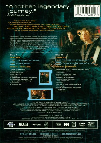 The long night has come. The Systems Commonwealth, the greatest civilization in history, has fallen. But now...One ship, one crew have vowed to drive back the night and rekindle the light of civilization. On the starship Andromeda, hope lives again! A determined Captain, a sentient warship, and an eclectic crew wage an urgent battle to save the universe on Gene Roddenberry's Andromeda. Striving to rebuild the Systems Commonwealth, Captain Dylan Hunt (Kevin Sorbo) and his crew journey to distant worlds aboard the advanced starship, Andromeda Ascendant. Enemies abound at every turn, from the treacherous Nietzscheans to the dreaded Magog. What began as a dream has now become a necessity. Will courage be enough? Disc 1: The Honey Offering Star-Crossed Disc 2: It Makes A Lovely Light It's Hour Come 'Round At Last |