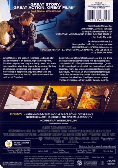 From Director Michael Bay (Armageddon, The Rock) comes an action-packed thrill ride that's an "explosive, mind-blowing assault on the senses!" (Clay Smith, The Insider.)Ewan McGregor and Scarlett Johansson lead an all-star cast as residents of an isolated, high-tech compound. But when they discover they're actually clones, and worth more dead than alive, they stage a daring escape. Battling an unfamiliar environment and an armed team of mercenaries in hot pursuit, they'll risk their lives and freedom to save those they left behind - and reveal the truth about The Island. ---------------------------------------------Le réalisateur Michael Bay (Armageddon, Le Rocher) propose une virée électrisante bourrée d’action qui procure un “bouleversement explosif et hallucinant de tous les sens!” (Clay Smith, The Insider).Ewan McGregor et Scarlett Johansson sont à la tête d’une distribution éblouissante dans le rôle de résidants d’un complexe isolé à la fine pointe de la technologie. Quand ils découvrent qu’ils sont en fait des clones et qu’ils valent davantage morts que vivants, ils organisent une évasion audacieuse. Affrontant un environnement inconnu avec une équipe de mercenaires armés à leurs trousses, ils risqueront leur vie et leur liberté pour sauver ceux qui n’ont pu s’échapper… et faire éclater la vérité sur L’Ile.