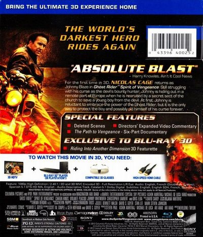 The WORLD'S DARKEST HERO RIDES AGAINABSOLUTE BLASTFor The First Time in 3D, Nicolas Cage returns as Johnny Blaze in Ghost Rider: Spirit Of Vengeance. Still struggling with his curse as the devil's bounty hunter, Johnny is hiding out in a remote part of Europe when he is recruited by a secret sect of the church to save a young boy from the devil. At first, Johnny is reluctant to embrace the power of the Ghost Rider, but it is the only way to protect the boy and possibly rid himself of his curse forever. |