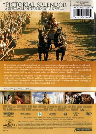 Power Was His DestinyFierce military commander, magnificent warrior, world conqueror. Legendary Macedonian hero Alexander the Great is celebrated in this definitive film about his tumultuous life. Richard Burton, Fredric March and Claire Bloom lead a "remarkable cast" (Leonard Maltin) of thousands in this epic film that seamlessly blends spectacular action, vivid character portrayals and an age-old tale of wisdom, blood and glory! Alexander (Burton) is a man torn by conflict between the lofty wisdom of his teacher, Aristotle (Barry Jones), loyalty to his warrior father (March) and his own grand design for world domination. In a turbulent world of political unrest, this ambitious young man must rise above all conflict to unite the continents of Europe and Asia...and become one of the most celebrated rulers of all time!
