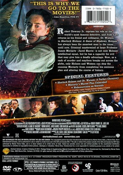 Robert Downey Jr. reprises his role as the world's most famous detective, Sherlock Holmes, and Jude Law returns as his friend and colleague, Dr. Watson, in "Sherlock Holmes: A Game of Shadows." Holmes has always been the smartest man in the room…until now. Criminal mastermind at large Professor James Moriarty (Jared Harris) is not only Holmes' intellectual equal, but he has a capacity for evil that may give him a deadly advantage. Now, as a rash of murder and mayhem breaks out across the globe, only Holmes and Watson can stop the cunning Moriaty from completing his ominous plan and altering the course of history. |