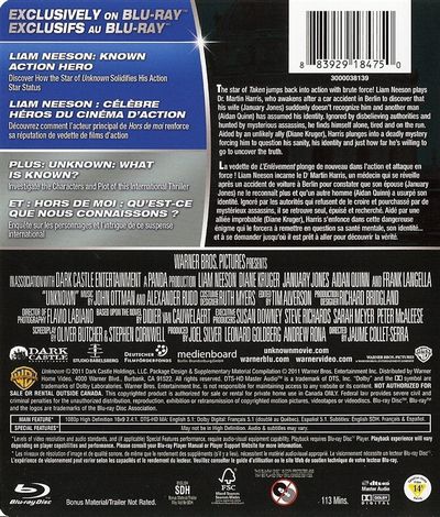 The star of Taken jumps back into action with brute force! Liam Neeson plays Dr. Martin Harris, who awakens after a car accident in Berlin to discover that his wife (January Jones) suddenly doesn't recognize him and another man (Aidan Quinn) has assumed his identity. Ignored by disbelieving authorities and hunted by mysterious assassins, he finds himself alone, tired and on the run. Aided by an unlikely ally (Diane Kruger), Harris plunges into a deadly mystery forcing him to question his sanity, his identity and just how far he's willing to go to uncover the truth.La vedette de L’Enlèvement plonge de nouveau dans l’action et attaque en force! Liam Neeson incarne le Dr. Martin Harris, un médecin qui se réveille après un accident de voiture à Berlin pour constater que son épouse (January Jones) ne le reconnaît plus et qu’un autre homme (Aidan Quinn) a usurpé son identité. Ignoré par les autorités qui refusent de le croire et pourchassé par de mystérieux assassins, il se retrouve seul, épuisé et recherché. Aide par une alliée improbable (DianeKruger), Harris s’enfonce dans cette dangereuse énigme qui le forcera à remettre en question sa santé mentale, son identité… et à se demander jusqu’où il est prêt à aller pour découvrir la vérité.