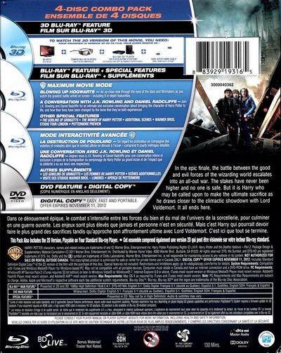 In the epic finale, the battle between the good :and evil forces of the wizarding world escalates into an all-out war. The stakes have never been higher and no one is safe. But it is Harry who may be called upon to make the ultimate sacrifice as he draws closer to the climactic showdown with Lord Voldemort. It all ends here.Dans ce dénouement épique, le combat s’intensifie entre les forces du bien et du mal de l’univers de la sorcellerie, pour culminer en une guerre ouverte. Les enjeux sont plus élevés que jamais et personne n'est en sécurité. Mais c'est Harry qui pourrait devoir faire le plus grand des sacrifices tandis qu'approche son affrontement ultime avec Lord Voldemort. C'est ici que tout se termine. |