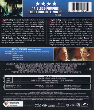 Ryan Gosling stars as a Hollywood stunt driver for movies by day and moonlights as a wheelman for criminals by night. Though a loner by nature, "Driver" can't help falling in love with his beautiful neighbor Irene (Carey Mulligan), a young mother dragged into a dangerous underworld by the return of her ex-convict husband. After a heist goes wrong, Driver finds himself driving defense for the girl he loves, tailgated by a syndicate of deadly serious criminals (Albert Brooks and Ron Perlman). Soon he realizes the gangsters are after more than the bag of cash and is forced to shift gears and go on the offense. |