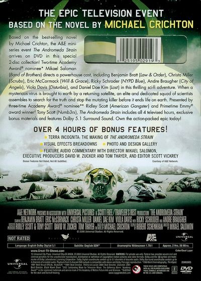 Based on the best-selling novel by Michael Crichton, the A&E mini-series event The Andromeda Strain arrives on DVD in this special 2-disc collection! Two-time Academy Award® nominee* Mikael Saloman ('Band of Brothers') directs a powerhouse cast, including Benjamin Bratt (Law & Order), Christa Miller (Scrubs), Eric McCormack (Will & Grace), Ricky Schroder (NYPD Blue), Andre Braugher (City of Angels), Viola Davis (Disturbia), and Daniel Dae Kim (Lost) in this thrilling sci-fi adventure. When a mysterious virus is brought to earth by a returning satellite, an elite and dedicated squad of scientists assembles to search for the truth and stop the mutating killer before it ends life on earth. Presented by three-time Academy Award® nominee** Ridley Scott (American Gangste') and Primetime Emmy award winner† Tony Scott (Numb3rs), 'The Andromeda Strain' includes all 4 televised hours, exclusive bonus materials and features Dolby 5.1 Surround Sound. Own the action-packed epic today!* 1989 Best Cinematography, The Abyss; 1991 Best Visual Effects, Backdraft** 1991 Best Director, Thelma & Louise; 2000 Best Director, Gladiator; 2001 Best Director, Black Hawk Down† 2002 Outstanding Made for Television Movie, The Gathering Storm |