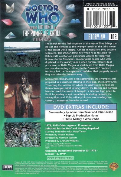 The search for the fifth segment of the Key to Time brings the Doctor and Romana to the swampy terrain of the third moon of the planet Delta Magna. Almost immediately, they become separated. The Doctor Draws fire when he is mistaken for Rohm-Dutt, a notorious gunrunner wanted for supplying firearms to the Swampies, an aboriginal people who were displaced to the marsh moon when human colonists too possession of Delta Magna. A Small team from Delta Magna are now developing a refinery in the Swampie's promised territory, but the Swampies are confident that, properly armed, they can drive the humans away.Meanwhile, Romana has been captured by the Swampies and prepared as a sacrificial offering to their god, the mighty Kroll. Thwarting the sacrifice (in which the god was nothing more than a Swampie priest in fancy dress), the Doctor and Romana have incurred the rath of Ranquin, a fanatical high priest to Kroll. Legendary or not, something is stirring beneath the swamp floor and, if the refinery's instrument readings are correct, it measures five miles across!