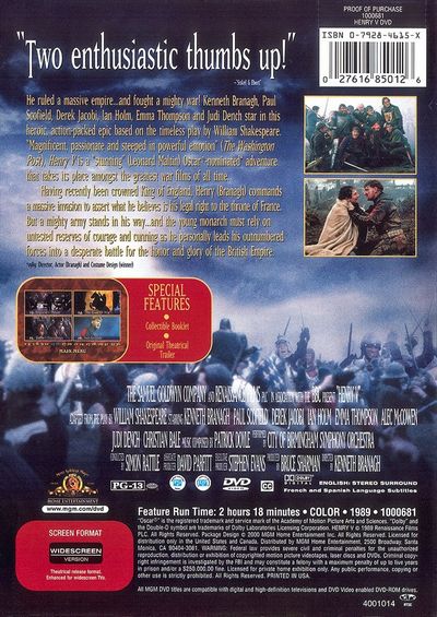 He ruled a massive empire...and fought a mighty war! Kenneth Branagh, Paul Scofield, Derek Jacobi, Ian Holm, Emma Thompson and Judi Dench star in this heroic, action-packed epic based on the timesless play by William Shakespeare. "Magnificent, passionate and steeped in powerful emotion" (The Washington Post), Henry V is a "stunning" (Leonard Maltin) Oscar®-nominated* adventure that takes its place amongst the greatest war films of all time.Having recently been crowned King of England, Henry (Branagh) commands a massive invasion to assert what he believes is his legal right to the throne of France. But a mighty army stands in his way...and the young monarch must rely on untested reserves of courage and cunning as he personally leads his outnumbered forces into a desperate battle for the honor and glory of the British Empire.*1989: Director, Actor (Branagh) and Costume Design (winner) |