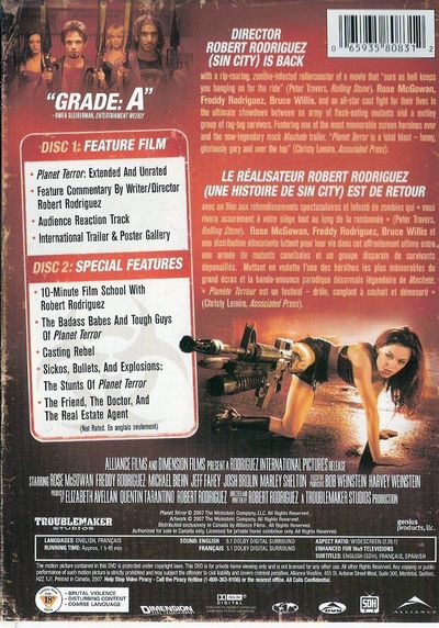 Director Robert Rodriguez (Sin City) is back with a rip-roaring, zombie-infested rollercoaster of a movie that "sure as hell keeps you hanging on for the ride" (Peter Travers, Rolling Stone). Rose McGowan, Freddy Rodriguez, Bruce Willis, and an all-star cast fight for their lives in the ultimate showdown between an army of flash-eating mutants and a motley group of rag-tag survivors. Featuring one of the most memorable screen heroines ever and the now legendary mock Machete trailer, "Planet Terror is a total blast - funny, gloriously gory and over the top" (Christy Lemire, Associated Press).LE RÉALISATEUR ROBERT RODRIGUEZ (UNE HISTOIRE DE SIN CITY) EST DE RETOUR avec un film aux rebondissements spectaculaires et infesté de zombies qui « vous rivera assurément à votre siège tout au long de la randonnée » (Peter Travers, Rolling Stone). Rose McGowan, Freddy Rodriguez, Bruce Willis et une distribution étincelante luttent pour leur vie dans cet affrontement ultime entre une armée de mutants cannibales et un groupe disparate de survivants dépenaillés. Mettant en vedette l’une des héroïnes les plus mémorables du grand écran et la bande-annonce parodique désormais légendaire de Machete, « Planète Terreur est un festival – drôle, sanglant à souhait et démesuré » (Christy Lemire, Associated Press).