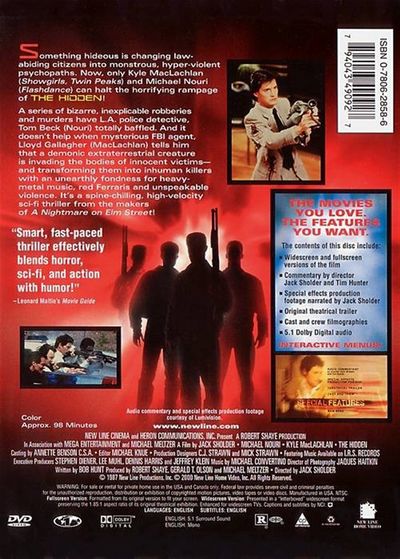 Something hideous is changing law-abiding citizens into monstrous, hyper-violent psychopaths. Now, only Kyle MacLachlan ('Showgirls', 'Twin Peaks') and Michael Nouri ('Flashdance') can halt the horrifying rampage of THE HIDDEN!A series of bizarre, inexplicable robberies and murders have L.A. police detective, Tom Beck (Nouri) totally baffled. And it doesn't help when mysterious FBI agent, Lloyd Gallagher (MacLachlan) tells him that a demonic extraterrestrial creature is invading the bodies of innocent victims - and transforming them into inhuman killers with an unearthly fondness for heavy-metal music, red Ferraris and unspeakable violence. It's a spine-chilling, high-velocity sci-fi thriller from the makers of 'A Nightmare on Elm Street'! |