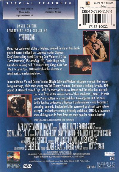 Terror Has A New Name… From The Terrifying Novel By Stephen KingMonstrous canine evil stalks a helpless, isolated family in this shock-packed horror-thriller from master Stephen King's best-selling novel! Starring Dee Wallace, Daniel Hugh-Kelly and Ed Lauter, CUJO unleashes the ultimate in nightmarish, unrelenting terror.In rural Maine, Vic and Donna Trenton struggle to repair their crumbling marriage, while their young son Tad (Danny Pintauro) befriends a hulking, lovable, 200-pound St. Bernard named Cujo. With Vic away on business, Donna and Tad take their decrepit car to be fixed at the remote farm of their mechanic (Lauter). As their aging Pinto sputters to a stop and dies, Cujo appears. But the once docile dog has undergone a hideous transformation - and becomes a slavering, demonic, implacable killer possessed by almost supernatural strength… and unholy cunning. Critically acclaimed, CUJO is a fearsome, spine-chilling tour de force from the most popular name in horror!