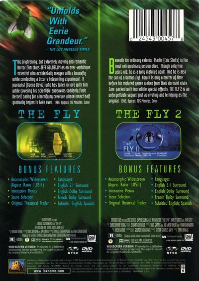 The FlyThis frightening, but extremely moving and romantic horror film stars Jeff Goldblum as an over-ambitious scientist who accidentally merges with a housefly while conducting a bizarre teleporting experiment. A journalist (Geena Davis) who has fallen in love with him while covering his scientific endeavors suddenly finds herself caring for a horrifying creature whose insect half gradually begins to take over.The Fly 2Beneath his ordinary exterior, Martin (Eric Stoltz) is the most extraordinary person alive. Though only five years old, he is a fully matured adult. And he is also the son of a human fly! Now it is only a matter of time before his mutated genes wake from their dormant state. Jam-packed with incredible special effects, THE FLY 2 is an unforgettable sequel, just as riveting and terrifying as the original.