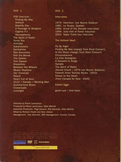 The R30 Deluxe Edition 2 DVD & 2 CD set features Rush's Frankfurt, Germany concert in September 2004 near the close of their 30th Anniversary World Tour. The performance was captured with 14 cameras in high definition and is presented in 16:9 widescreen format. Audio options include Dolby Digital 5.1 Surround Sound or PCM Stereo. Songs include the exclusive "R30 Overture" (an instrumental medley of "Finding My Way," "Anthem," "Bastille Day," "A Passage To Bangkok," "Cygnus X-1," and "Hemispheres), "Xanadu," "Subdivisions," "Red Barchetta," "Summertime Blues" (from last year's covers EP Feedback), and the "vault" track "Between The Wheels" which hasn't been performed live in 20 years.The 2 CD soundtrack is not available separately. Bonus features include rare and classic performance footage from the late '70s to the Canadian Tsunami Relief Benefit earlier this year along with interviews from throughout the band's career. Also contains two limited edition Rush guitar picks and souvenir backstage pass.