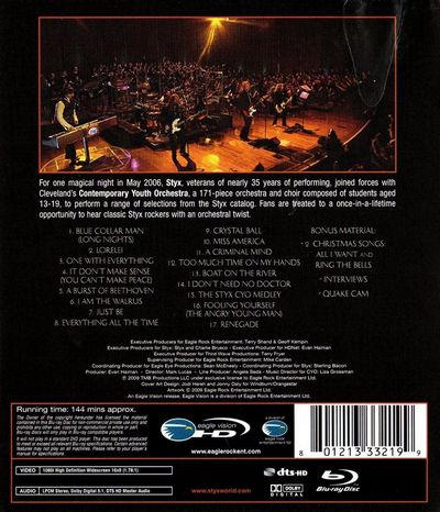 For one magical night in May 2006, Styx, veterans of nearly 35 years of performing, joined forces with Cleveland's Contemporary Youth Orchestra, a 171-piece orchestra and choir composed of students aged 13-19, to perform a range of selections from the Styx catalog. Fans are treated to a once-in-a-lifetime opportunity to hear classic Styx rockers with an orchestral twist. TRACK LISTING: 1) Blue Collar Man (Long Nights) 2) Lorelei 3) One With Everything 4) It Don't Make Sense (You Can't Make Peace) 5) A Burst of Beethoven6) I Am The Walrus 7) Just Be 8) Everything All The Time 9) Crystal Ball 10) Miss America 11) Criminal Mind 12) Too Much Time On My Hands 13) Boat On The River 14) I Don't Need No Doctor 15) The Styx / CYO Medley 16) Fooling Yourself (The Angry Young Man) 17) Renegade