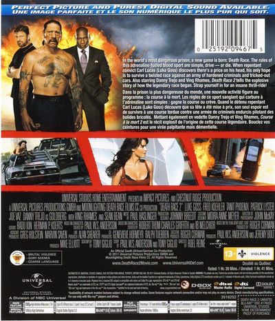 In the world's most dangerous prison, a new game is born: Death Race. The rules of this adrenaline-fueled blood sport are simple, drive-or die. When repentant convict Carl Lucas (Luke Goss) discovers there's a price on his head, his only hope is to survive a twisted race against an army of hardened criminals and tricked-out cars. Also staring Danny Trejo and Ving Rhames, Death Race 2 tells the explosive story of how the legendary race began. Strap yourself in for an insane thrill-ride!Dans la prison la plus dangereuse du monde, une nouvelle activité figure au programme: la course à la mort. Les règles de ce sport sanglant qui carbure à l'adrénaline sont simples: gagne la course ou crève. Quand le détenu reprenant Carl Lucas (Luke Goss) découvre que sa tête a été mise à prix, son seul espoir est de survive à une course tordue contre une armée de criminels endurcis pilotant des bolides bricolés. Mettant également en vedette Danny Trejo et Ving Rhames, Course à la mort 2 est le récit explosif de l'origine de cette course légendaire. Bouclez vos ceintures pour une virée palpitante mais démentielle.