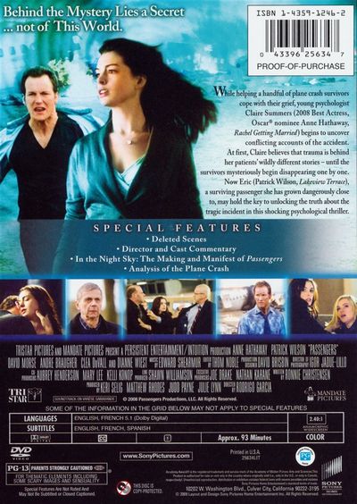The Line Between This World And The Next Is About To Be Crossed.While helping a handful of plane crash survivors cope with their grief, young psychologist Claire Summers (2008 Best Actress, Oscar nominee Anne Hathaway, Rachel Getting Married) begins to uncover conflicting accounts of the accident. At first, Claire believes that trauma is behind her patients' wildly different stories - until the survivors mysteriously begin disappearing on by one. Now Eric (Patrick Wilson, Lakeview Terrace), a surviving passenger she has grown dangerously close to, may hold the key to unlocking the truth about the tragic incident in this shocking psychological thriller. |