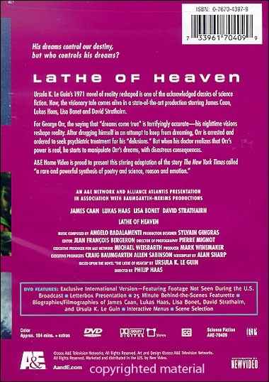 His dreams controls our destiny, but who controls his dreams?Lathe of HeavenUrsula K. Le Guin's 1971 novel of reality reshaped is one of the acknowledged classics of science fiction. Now, the visionary tale comes alive in a state-of-the-art productions starring James Caan, Lukas Haas, Lisa Bonet and David Straithairn.For George Orr, the saying that "dreams come true" is terrifyingly accurate -- his nighttime visions reshape reailty. After drugging himself in an attempt to keep from dreaming, Orr is arrested and ordered to seek psychiatric treatment for his "delusions." But when his doctor realizes that Orr's power is real, he starts to manipulate Orr's dreams, with disastrous consquences.A & E Home Video is proud to present this stirring adaptation of the story The New York Times called "a rare and pwerful synthesis of poetry and science, reason and emotion."