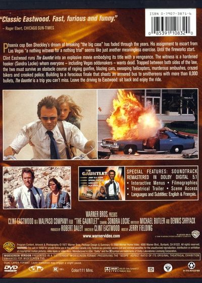 Phoenix cop Ben Shockley's dream of breaking "the big case" has faded through the years. His assignment to escort from Las Vegas "a nothing witness for nothing trial" seems like just another meaningless exercise. Until the fireworks star. Clint Eastwood runs "The Gauntlet" into an explosive movie embodying its title with a vengeance. The witness is a hardened hooker whom everyone - including Vegas oddsmakers - wants dead. Trapped between both sides of the law, the two must survive an obstacle course of raging gunfire, blazing cars, swooping helicopters, murderous ambushes, crazed bikers and crooked police. Building to a ferocious finale that shoots an armored bus to smithereens with more than 8,000 bullets, "The Gauntlet" is a trip you can't miss. Leave the driving to Eastwood" sit back and enjoy the ride. |