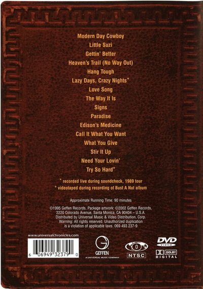 TracklistModern Day CowboyLittle SuziGettin' BetterHeaven's Trail (No Way Out)Hang ToughLazy Days Crazy NightsLove SongsThe Way It IsSignsParadiseEdison's MedicineCall It What You WantWhat You GiveStir It UpNeed Your Lovin' (recorded live during soundcheck 1989 tour)Try So Hard (videotaped during recording of Bust a Nut album) |