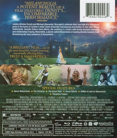 Justine (Kirsten Dunst) and Michael (Alexander Skarsgård) celebrate their marriage at a sumptuous party in the home of Justine's sister Claire (Charlotte Gainsbourg) and brother-in-law John (Kiefer Sutherland). Despite Claire's best efforts, the wedding is a fiasco, with family tensions mounting and relationships fraying. Meanwhile, a planet called Melancholia is heading directly towards Earth, threatening the very existence of humankind... |