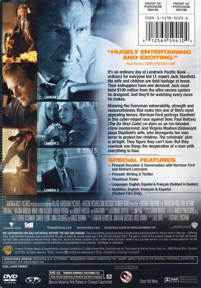 It's an ordinary day at Landrock Pacific Bank - ordinary for everyone but I.T. expert Jack Stanfield. His wife and children are held hostage at home. Their kidnappers have one demand: Jack must heist $100 million from the ultra-secure system he designed. And they'll be watching every move he makes.Showing the Everyman vulnerability, strength and resourcefulness that make him one of film's most appealing heroes, Harrison Ford portrays Stanfield in this cyber-edged race against time. Paul Bettany (The Da Vinci Code) co-stars as an ice-blooded crime mastermind. And Virginia Madsen (Sideways) plays Stanfield's wife, who disregards her own terror to protect her children. The criminals' plan is airtight. They figure the can't lose. But they overlook one thing: the desperation of a man with everything to lose. |