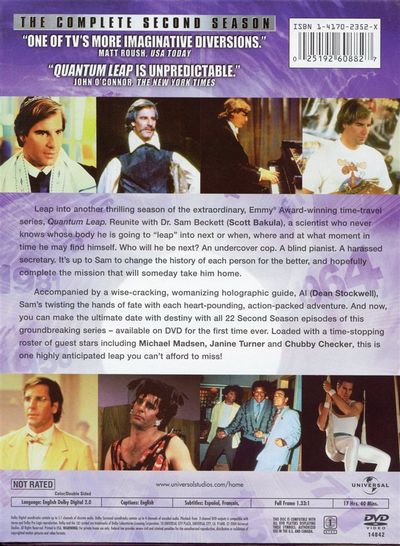 Leap into another thrilling season of the extraordinary, Emmy Award-winning time-travel series, Quantum Leap. Reunite with Dr. Sam Beckett (Scott Bakula), a scientist who never knows whose body he is going to leap into next or when, where and at what moment in time he may find himself. Who will he be next? An undercover cop. A blind pianist. A harassed secretary. It s up to Sam to change the history of each person for the better, and hopefully complete the mission that will someday take him home.Accompanied by a wise-cracking, womanizing holographic guide, Al (Dean Stockwell), Sam s twisting the hands of fate with each heart-pounding, action-packed adventure. And now, you can make the ultimate date with destiny with all 22 Second Season episodes of this groundbreaking series available on DVD for the first time ever. Loaded with a time-stopping roster of guest stars including Michael Madsen, Janine Turner and Chubby Checker, this is one highly anticipated leap you can t afford to miss! |