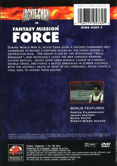 During World War II, Jackie Chan joins a cracked commando unit assembled to retake a fortune stolen by the enemy during a destructive raid. The group is led by the mysterious "Devil Sergeant", who ruthlessly leads the men through rampant vicious battles. Jackie soon finds himself caught in a deadly double-cross, and fights a battle unrivaled in screen violence. With the untimely death of most of his comrades, Jackie fights a final duel to avenge their deaths. |