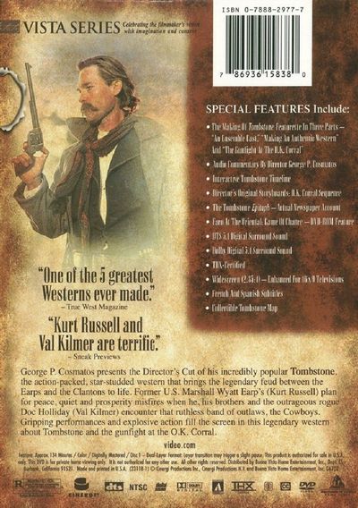 George P. Cosmatos presents the Director's Cut of his incredibly popular Tombstone, the action-packed, star-studded western that brings the legendary feud between the Earps and the Clantons to life. Former U.S. Marshall Wyatt Earp's (Kurt Russell) plan for peace, quiet and prosperity misfires when he, his brothers and the outrageous rogue Doc Holliday (Val Kilmer) encounter that ruthless band of outlaws, the Cowboys. Gripping performances and explosive action fill the screen in this legendary western about Tombstone and the gunfight at the O.K. Corral. |