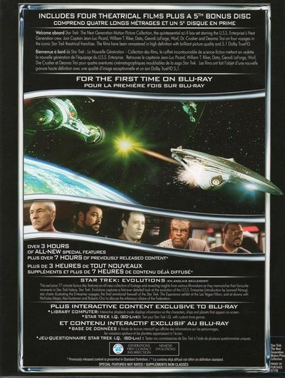 Includes four theatrical films plus a 5th bonus discWelcome aboard Start Trek: The Next Generation Motion Picture Collection, the quintessential Sci-Fi box set starring the U.S.S. Enterprise's Next Generation crew. Join Captain Jean-Luc Picard, William T. Riker, Data, Geordi LaForge, Worf, Dr. Crusher and Deanna Troi on four voyages in the iconic Star Trek theatrical franchise. The films have been remastered in high definition with brilliant picture quality and 5.1 Dolby TrueHD.For the first time on Blu-Ray |