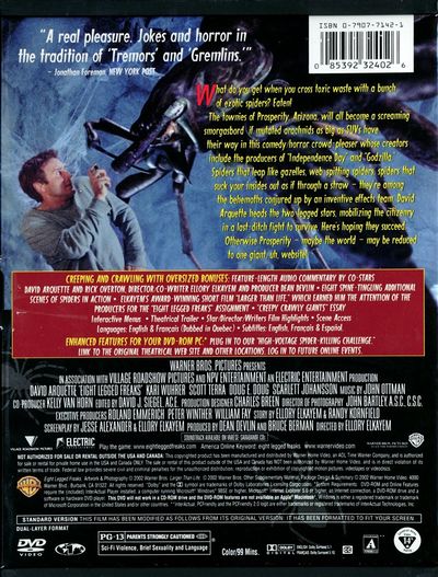 What do you get when you cross toxic waste with a bunch of exotic spiders? Eaten!The townies of Prosperity, Arizona will all become a screaming smorgasbord if mutated arachnids as big as SUVs have their way in this comedy horror crowd-pleaser whose creators include the producers of "Independence Day" and "Godzilla." Spiders that leap like gazelles, web-spitting spiders, spiders that suck out your insides out as if through a straw - they're among the behemoths conjured up by an inventive effects team, David Arquette heads the two-legged stars, mobilizing the citizenry in a last-ditch fight to survive. Here's hoping they succeed. Otherwise Prosperity - maybe the world - may be reduced to one giant, uh, website! |