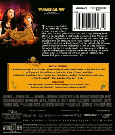 The coolest spy kids in the world are back for a huge new adventure! This time, Carmen (Alexa Vega) and Juni (Daryl Sabara) head off on a mission that's a real family affair, including Mom and Dad (Carla Gugino and Antonio Banderas), and even their spy grandparents too (Holland Taylor and Richardo Montalban). It will take their entire family to defeat the evil scientist Romero (Steve Buscemi) and his mysterious island of crazy creatures. But when the Cortez family bands together, armed with their super hi-tech gadgets and great teamwork, nothing can stand in their way! Don't miss the thrilling second installment in Robert Rodriguez's awesome franchise. |