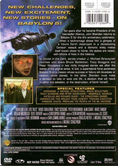 Ten years after he became President of the Interstellar Alliance, John Sheridan returns to Babylon 5 for the IA's anniversary celebration. When a technomage shows him a glimpse of a future Earth destroyed in a devastating Centauri assault and a demonic entity makes itself known closer to home, the stakes are raised with billions of lives in the balance.In Voices In The Dark, series creator J. Michael Straczynski reunites with stars Bruce Boxleitner, Tracy Scoggins and Peter Woodward in two richly imagined stories set after the events of the original series. In one, a supernatural force penetrates Babylon 5 on a mission whose success or failure will devastate or redeem whole planets. In the other, Sheridan must make a decision to take or save one life... a decision that will result in either the salvation, or the destruction, of Earth herself.