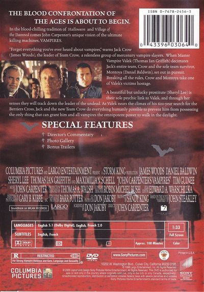 THE BLOOD CONFRONTATION OF THE AGES IS ABOUT TO BEGINIn the blood-chilling tradition of Halloween and Village of the Damned comes John Carpenter's unique vision of the ultimate killing machines, VAMPIRES."Forget everything you've ever heard about vampires," warns Jack Crow (James Woods), the leader of Team Crow, a relentless group of mercenary vampire slayers. When Master Vampire Valek (Thomas Ian Griffith) decimates Jack's entire team, Crow and the sole team survivor, Montoya (Daniel Baldwin), set out in pursuit. Breaking all the rules, Crow and Montoya take one of Valek's victims hostage.A beautiful but unlucky prostitute (Sheryl Lee) is their sole psychic link to Valek, and through her sense they will track down the leader of the undead. As Valek nears the climax of his 600-yer search for the Beziers Cross, Jack and the new Team Crow do everything humanly possible to prevent him from possessing the only thing that can grant him and all vampires the omnipotent power to walk in daylight. |