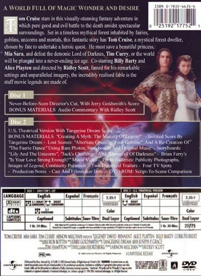 Tom Cruise stars in this visually-stunning fantasy adventure in which pure good and evil battle to the death amidst spectacular surroundings. Set in a timeless mythical forest inhabited by fairies, goblins, unicorns and mortals, this fantastic story has Tom Cruise, a mystical forest dweller, chosen by fate to undertake a heroic quest. He must save a beautiful princess, Mia Sara, and defeat the demonic Lord of Darkness, Tim Curry, or the world will be plunged into a never-ending ice age. Co-starring Billy Barty and Alice Playten and directed by Ridley Scott, famed for his remarkable settings and unparalleled imagery, the incredibly realized fable is the stuff movie legends are made of. |