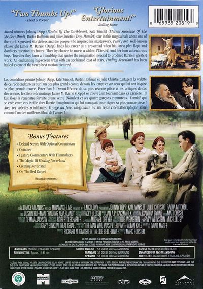 Award winners Johnny Depp (Pirates of the Caribbean), Kate Winslet (Eternal Sunshine Of The Spotless Mind), Dustin Hoffman and Julie Christie (Troy, Hamlet) star in this magical tale about one of the world's greatest storytellers and the people who inspired his masterwork, Peter Pan! Well-known playwright James M. Barrie (Depp) finds his career at a crossroad when his latest play flops and doubters question his future. Then by chance he meets a widow (Winslet) and her four adventurous boys. Together they form a friendship that ignites the imagination needed to produce Barrie's greatest work! An enchanting big-screen treat with an acclaimed cast of stars, Finding Neverland has been hailed as one of the year's best motion pictures! |