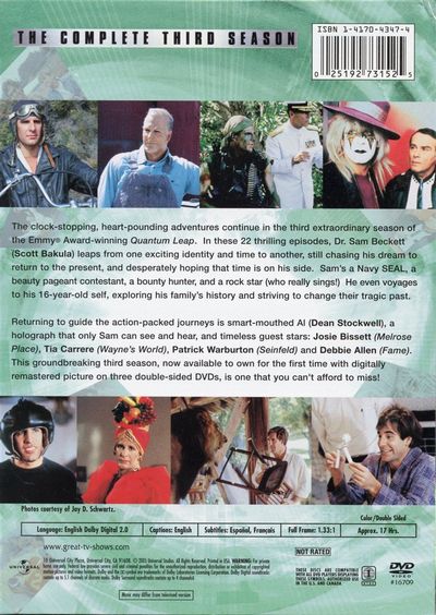 The clock-stopping, heart-pounding adventures continue in the third extraordinary season of the Emmy Award- winning Quantum Leap. In these 22 thrilling episodes, Dr. Sam Beckett (Scott Bakula) leaps from one exciting identity and time to another, still chasing his dream to return to the present, and desperately hoping that time is on his side. Sam s a Navy SEAL, a beauty pageant contestant, a bounty hunter, a rock star (who really sings!). He even voyages to his 16-year-old self, exploring his family s history and striving to change their tragic past.Returning to guide the action-packed journeys is smart-mouthed Al (Dean Stockwell), a holograph that only Sam can see and hear, and timeless guest stars: Josie Bissett (Melrose Place), Tia Carrere (Wayne s World), Patrick Warburton (Seinfeld) and Debbie Allen (Fame). This groundbreaking third season, now available to own for the first time on three double-sided DVD s, is one that you can t afford to miss!